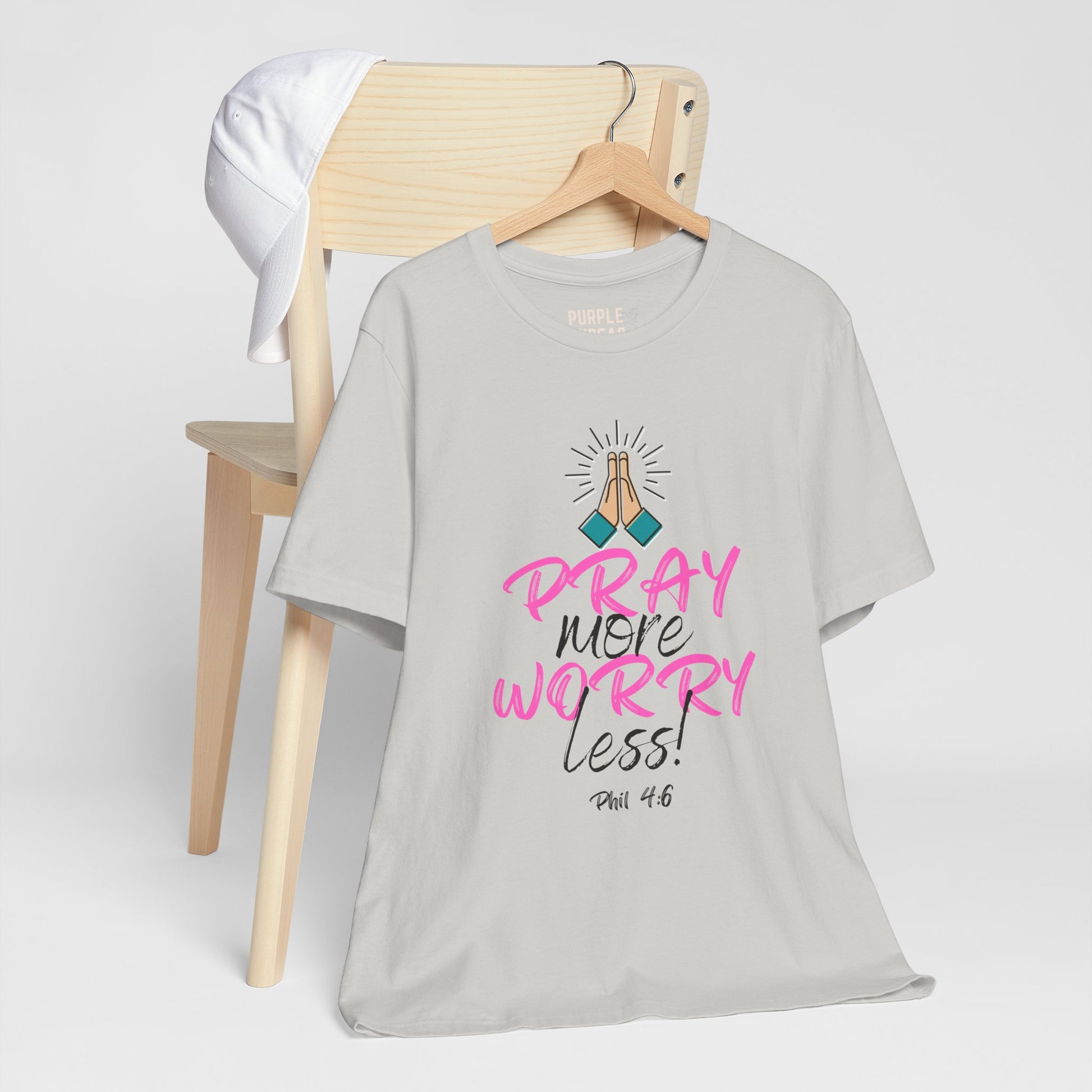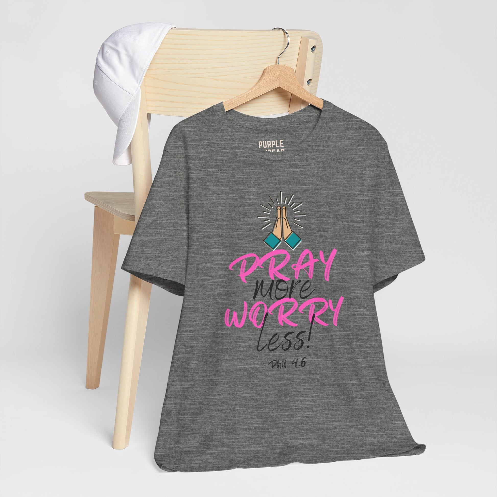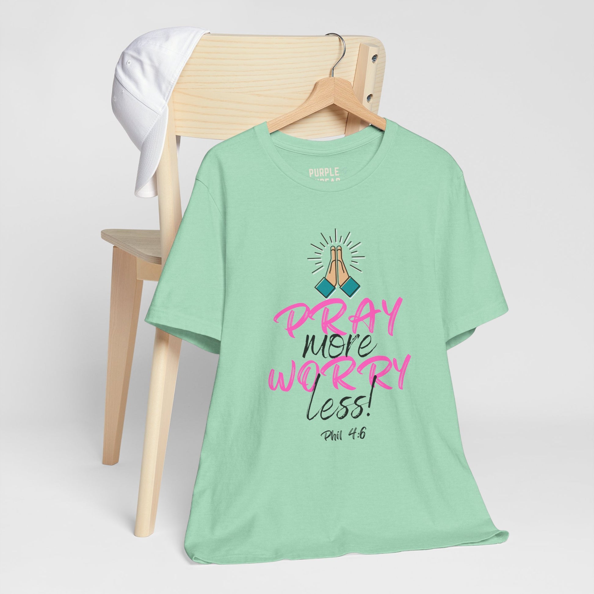 This everyday favorite speaks to the heart of Matthew 6:34 and Philippians 4:6–7—reminding us to stop carrying what God never asked us to hold. The “Pray More, Worry Less” T-shirt is a soft but strong declaration that faith > fear, and that peace is only one prayer away.