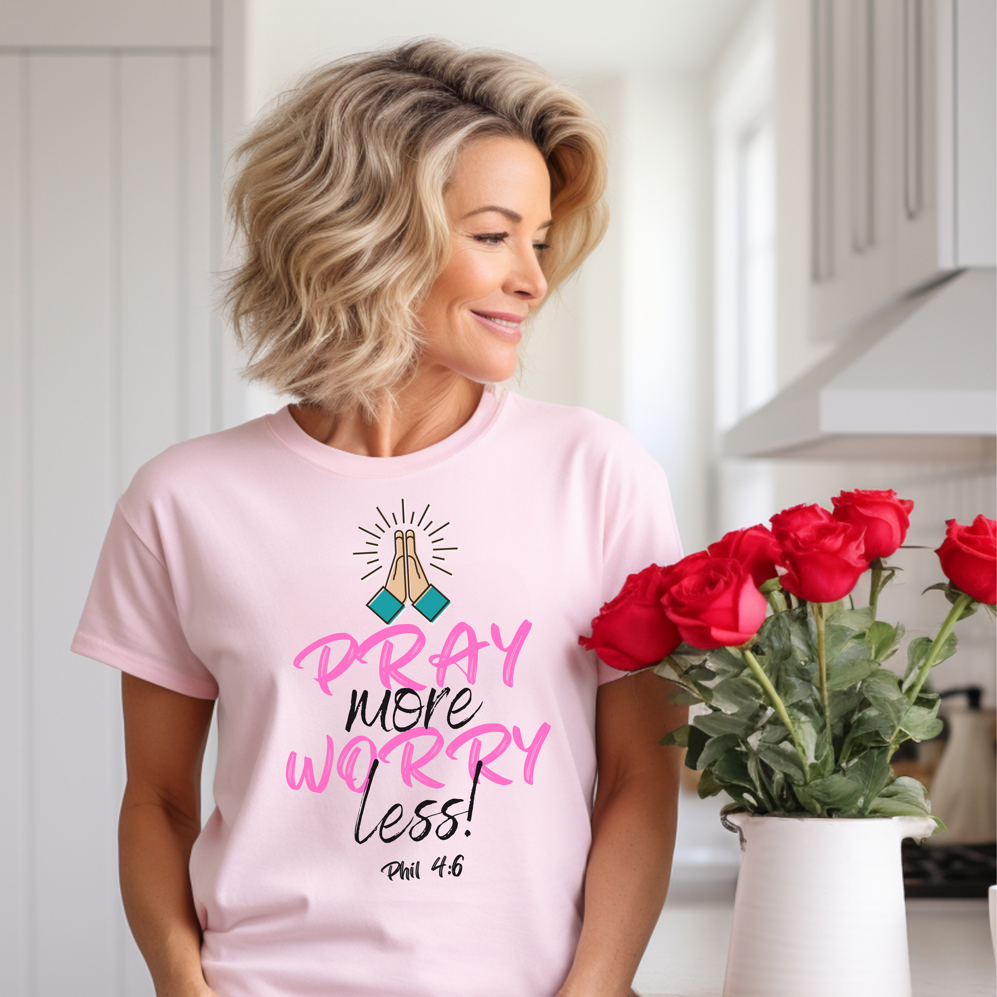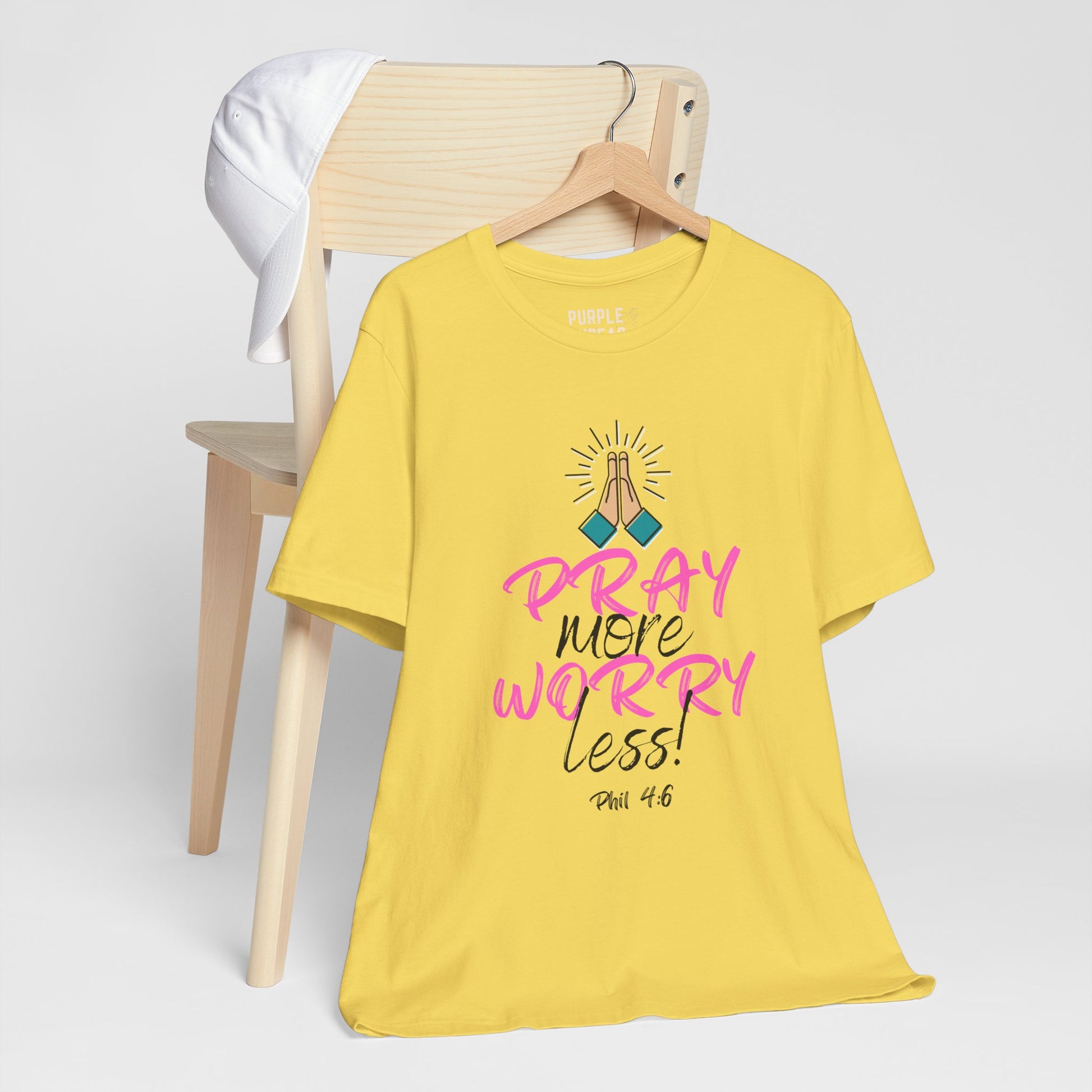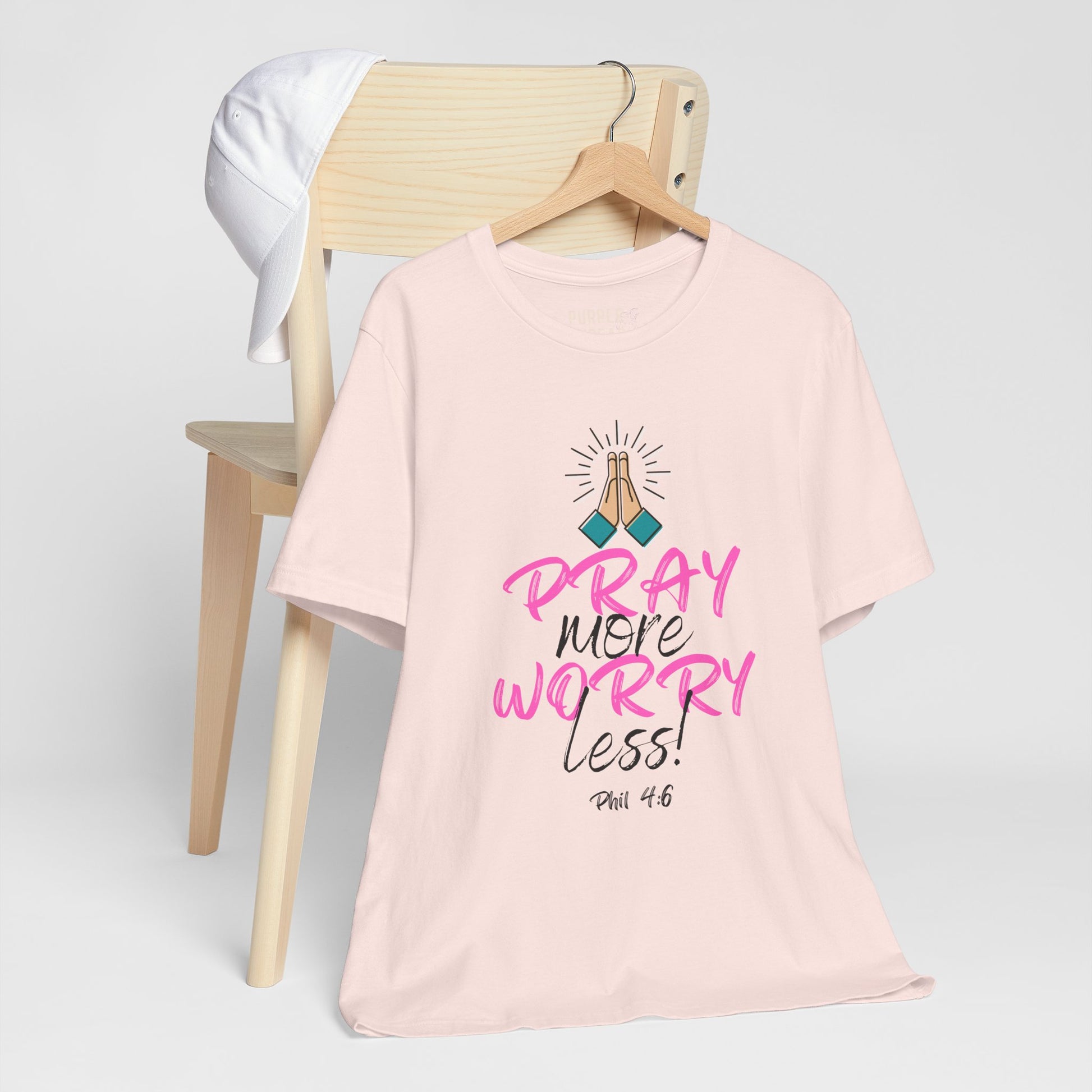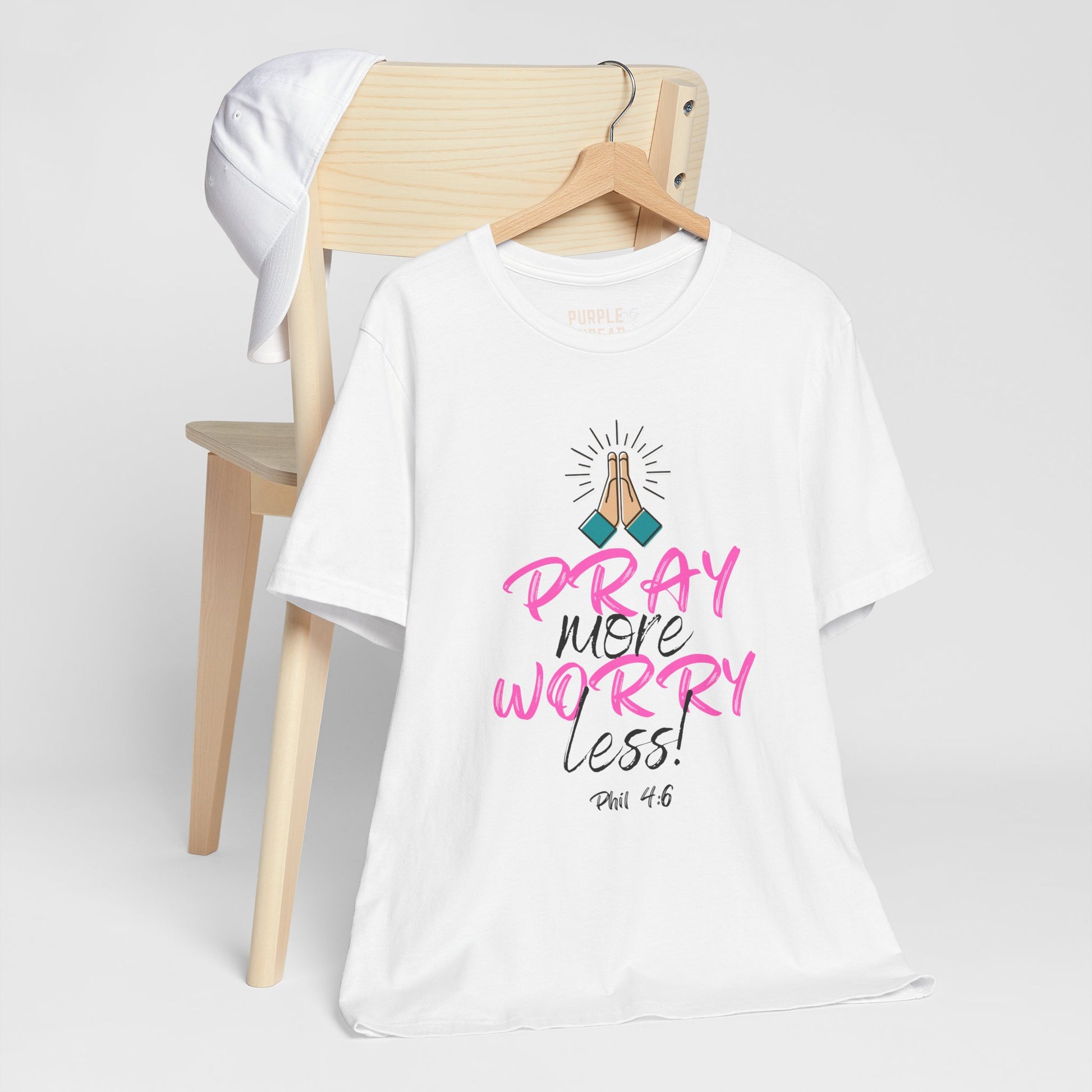 This everyday favorite speaks to the heart of Matthew 6:34 and Philippians 4:6–7—reminding us to stop carrying what God never asked us to hold. The “Pray More, Worry Less” T-shirt is a soft but strong declaration that faith > fear, and that peace is only one prayer away.