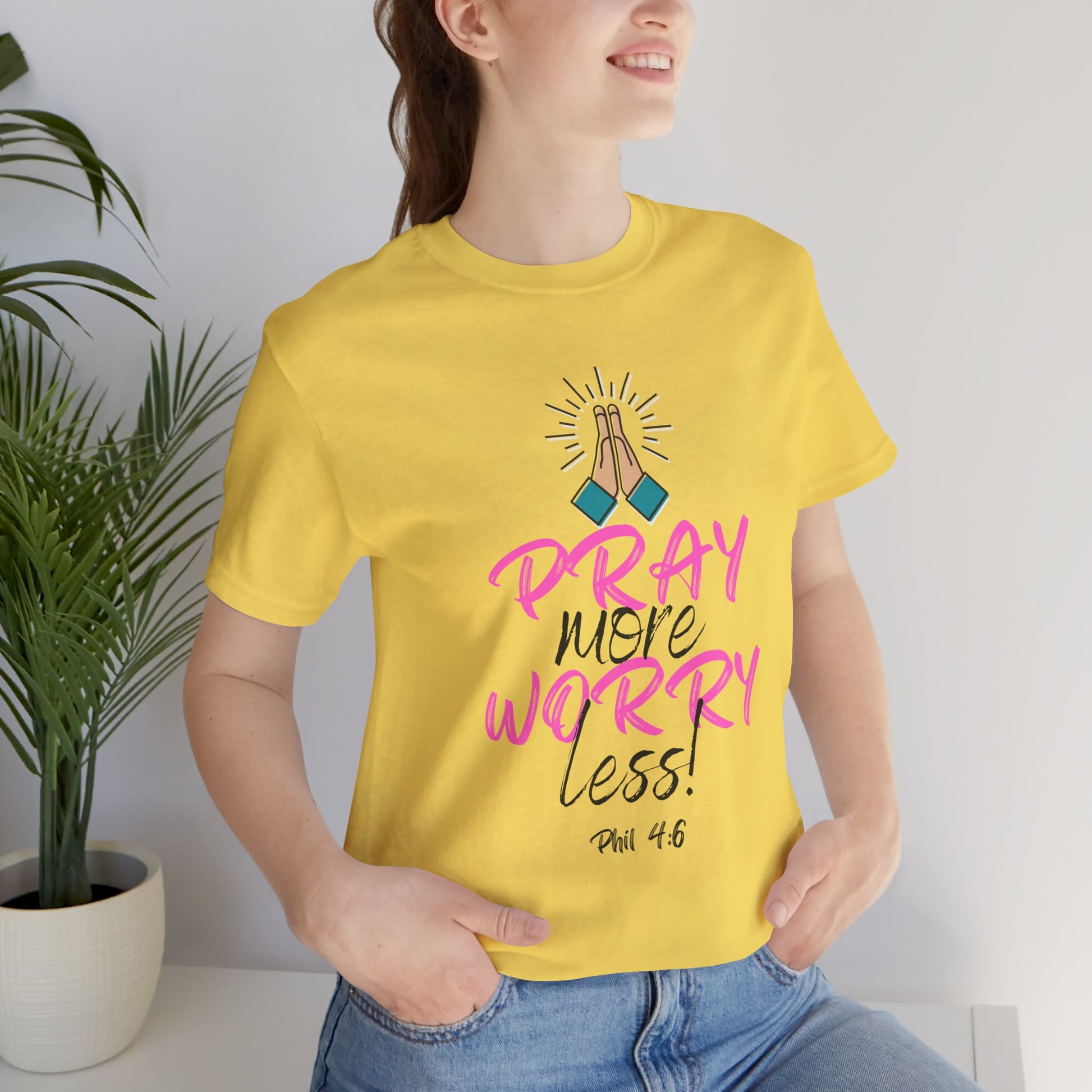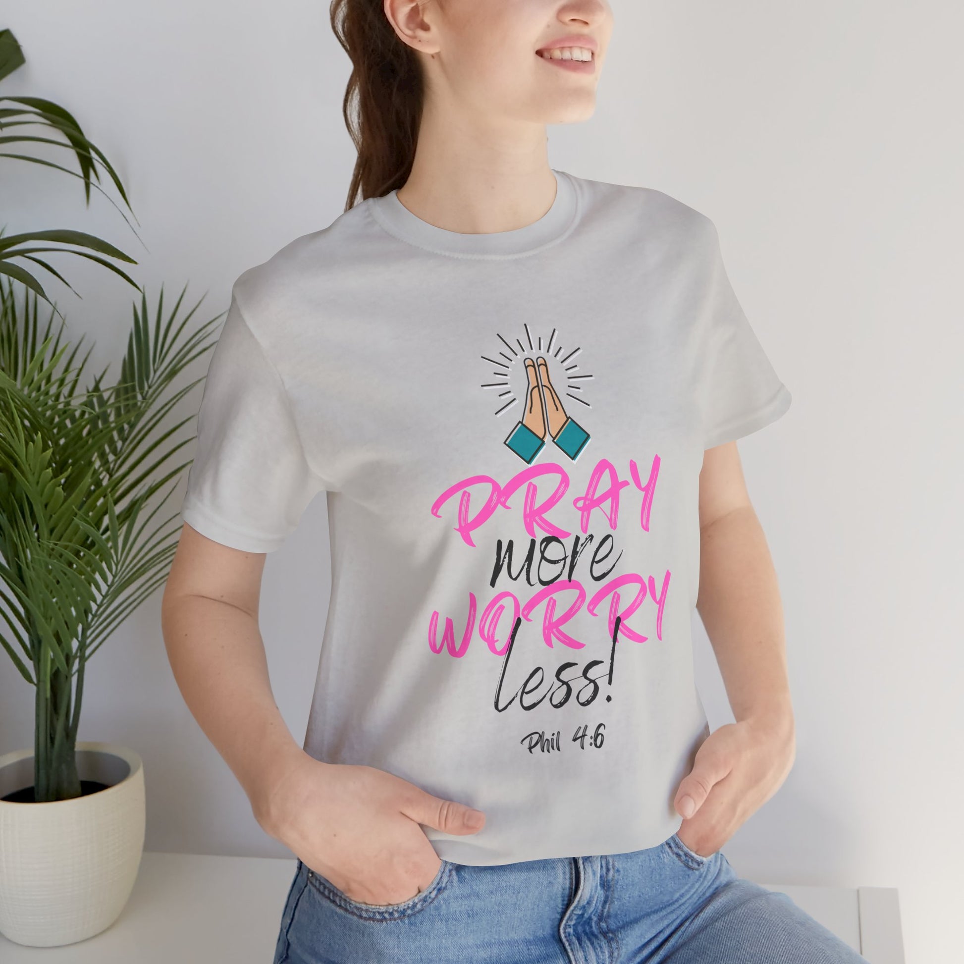 Introducing this stylish Unisex Jersey Short Sleeve Tee, designed to inspire positivity and mindfulness. With its vibrant print reading 'Pray more, worry less!' alongside a beautiful graphic, this tee radiates a feel-good vibe perfect for everyday wear. Ideal for casual outings, spiritual gatherings, or simply lounging at home, it encourages a calm mindset wherever you go. The lightweight fabric and classic fit ensure comfort during all your activities. This tee is perfect for adults who value both style and meaningful messages, making it a wonderful gift for birthdays, holidays, and special occasions, especially around spiritual observances. Whether for a friend or yourself, it’s a thoughtful reminder to embrace peace in a busy world.